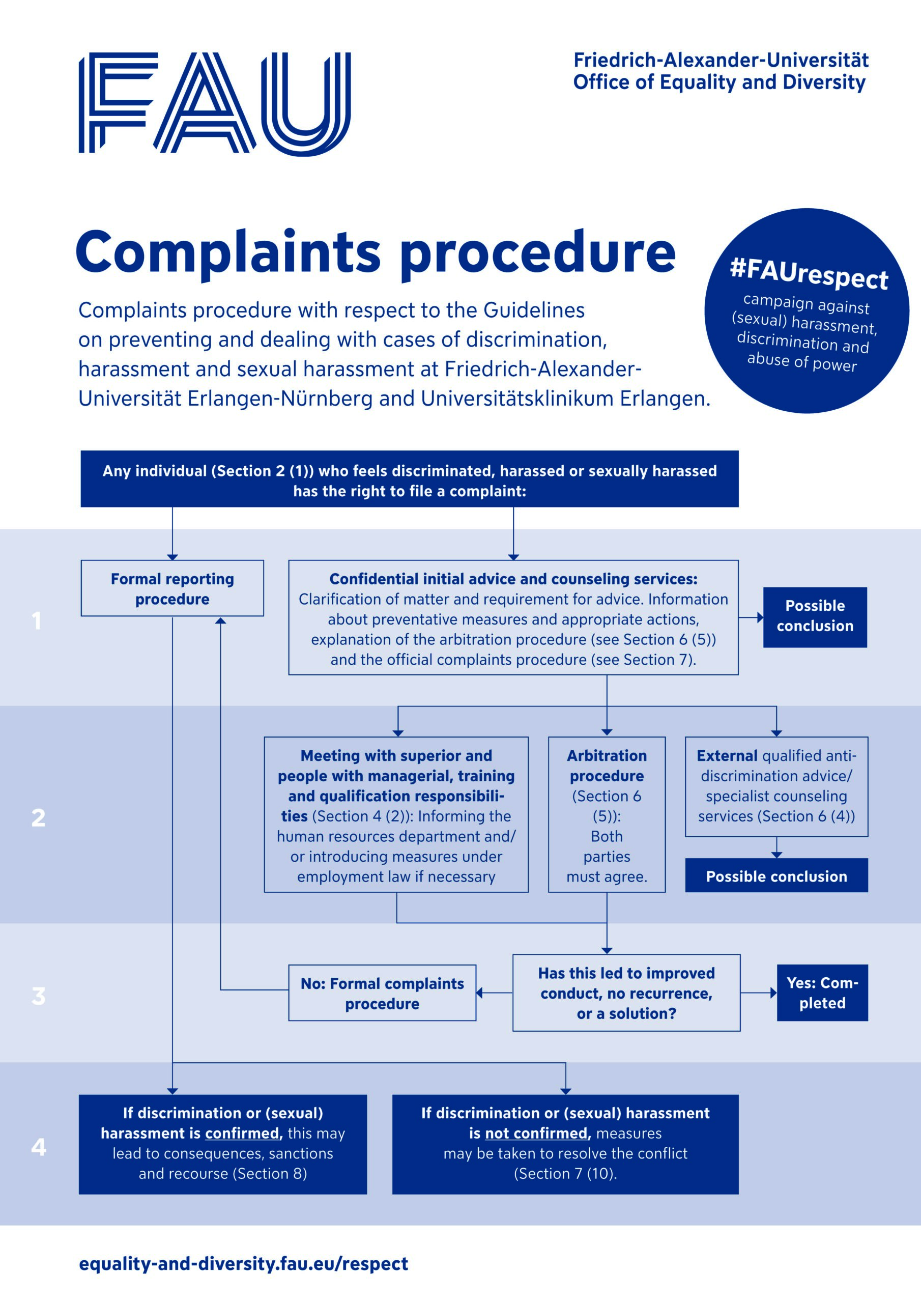 The complaints procedure is regulated in Sections 7 and 8 of the Guidelines on preventing and dealing with cases of discrimination, harassment and sexual harassment at Friedrich-Alexander-Universität Erlangen-Nürnberg (FAU) and Universitätsklinikum Erlangen (UKER) dated 1 June 2021.