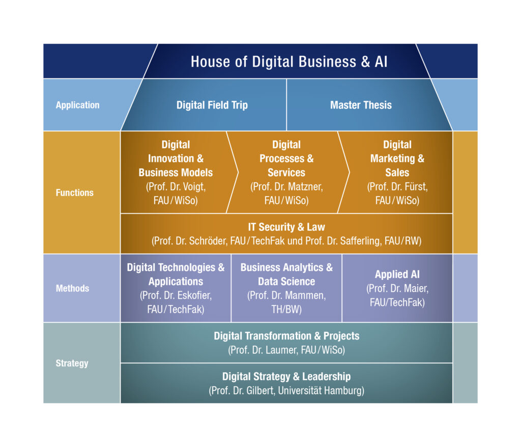 Together they form the „House of Digital Business & AI“, consisting of the foundation („Strategy“), two further levels („Methods“ and „Functions“) and the roof („Applications“).