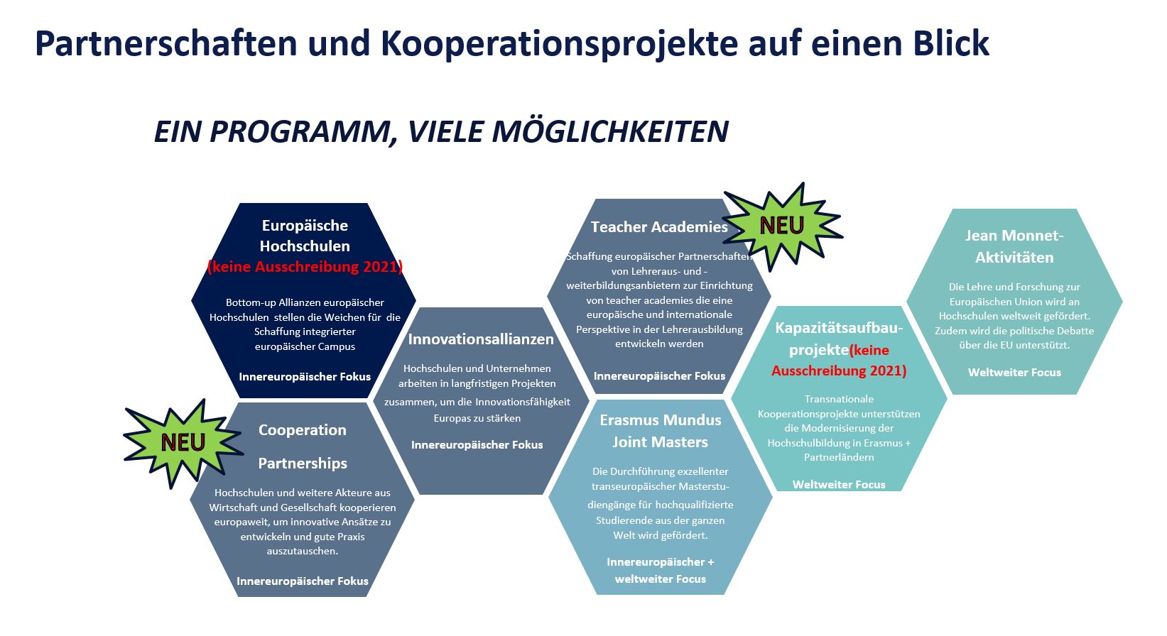 The EuRopean Action Scheme for the Mobility of University Students – Erasmus+ – is the new EU program for education, training, youth and sport which was launched on January 1, 2014. Some funding projects running under key action 1 from rounds 2019 and 2020 will still continue until July 31, 2022 or 2023. This applies in particular to projects with universities in partner countries (international credit mobility – KA107). KA103 will also fund mobility for students and staff to the United Kingdom until March 31, 2023.